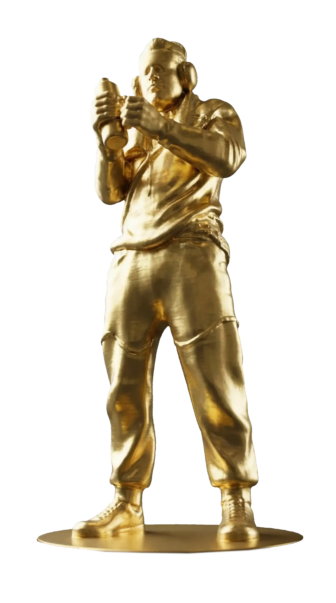 Limited edition golden statue. THE BAD GUY finally got what he deserved. A symbol of freedom and justice. Each statue is a high-quality 3D print hand-finished with premium gold paint. Own this moment forever.